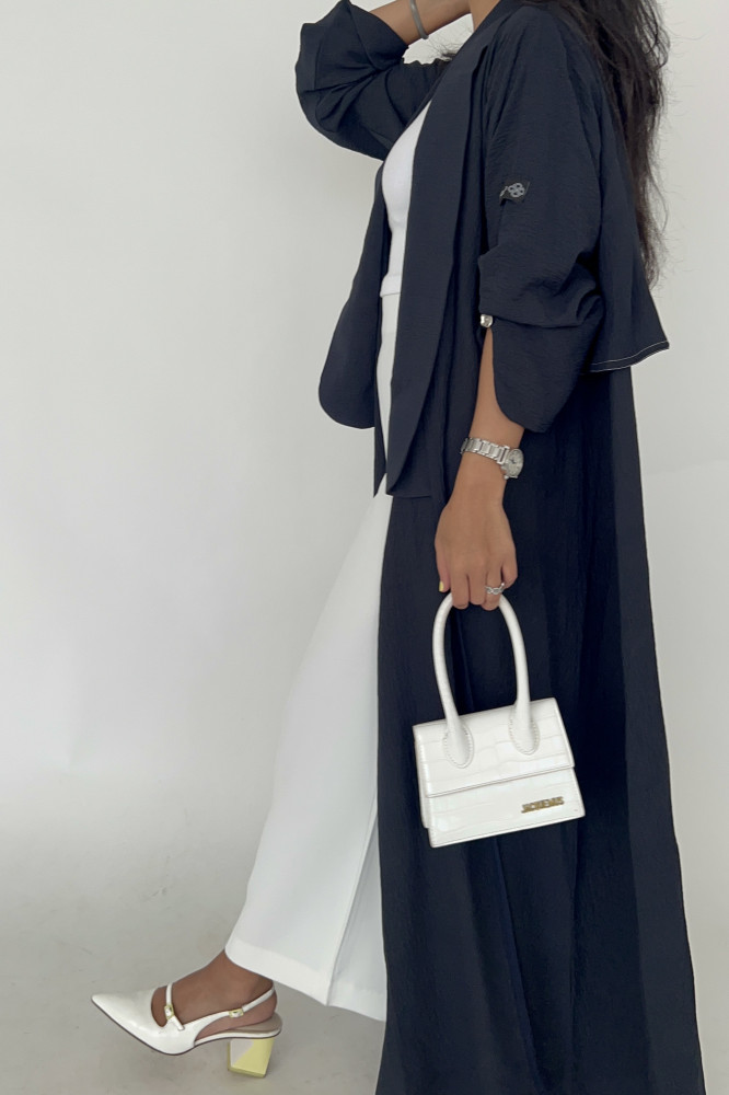 كريب مغسول اللون كحلي قصة بلايزر ازرار شكل وطرحه ساده باللون الكحلي