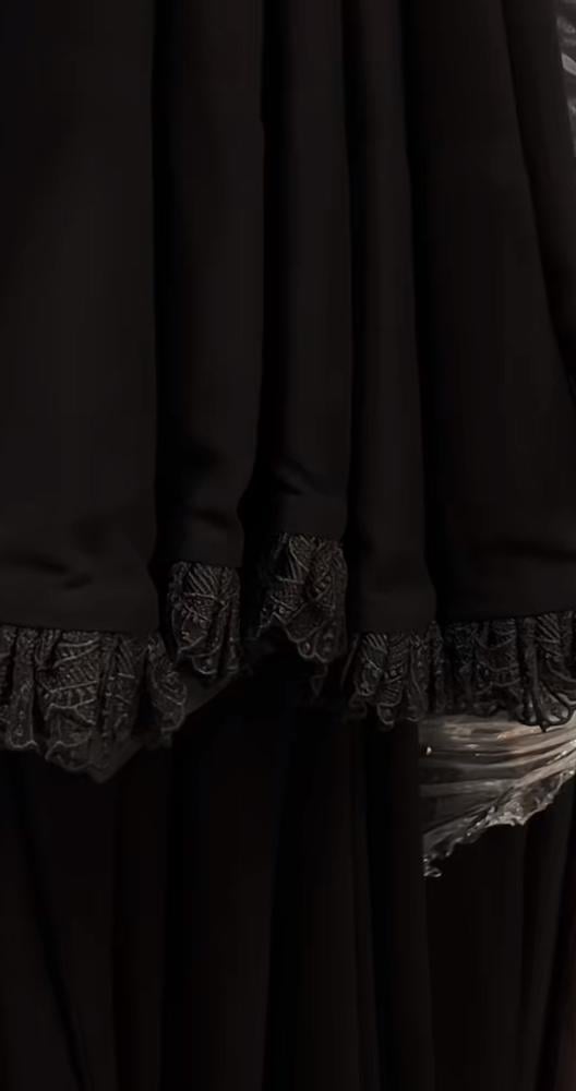 كريب ملكي كوري (سواد فاحم وجودة عالية) الاكمام والطرحه دانتيل القصه كلوش .